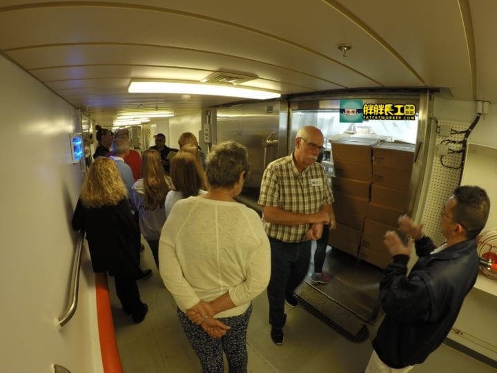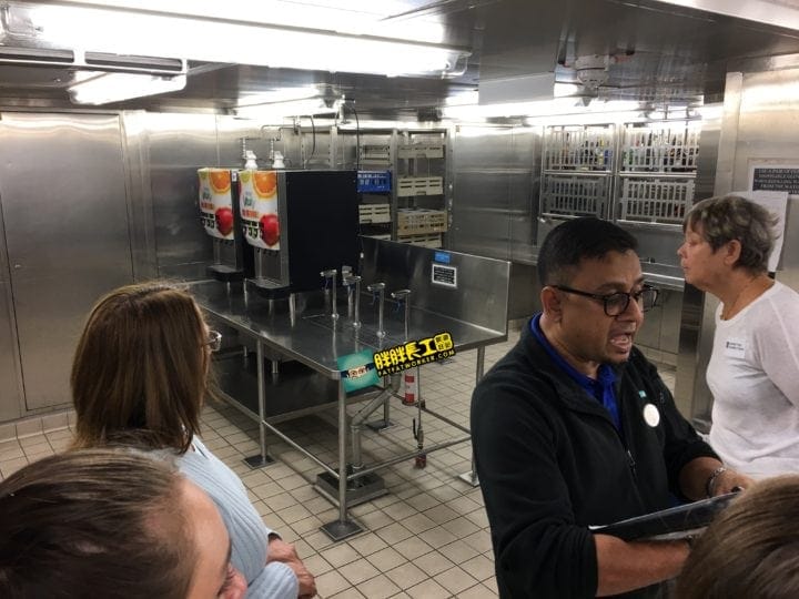 由於有大量的碗盤,因此洗盤子是靠機器,工作人員需要把洗乾淨的盤子疊起來。接著是食物的儲藏室,只能說非常的震驚。一個超大的冷藏庫,冷凍了幾乎全滿的肉品。廚師跟我們說,前幾天這一個冷凍庫幾乎全空,但由於剛剛補貨,所以這一個冷藏庫現在再度爆滿。其實,郵輪每隔幾天就會停靠在比較大或者是比較方便補給的港口,這時他們就會補充新的蔬菜、肉類、水果,全部重新reload。