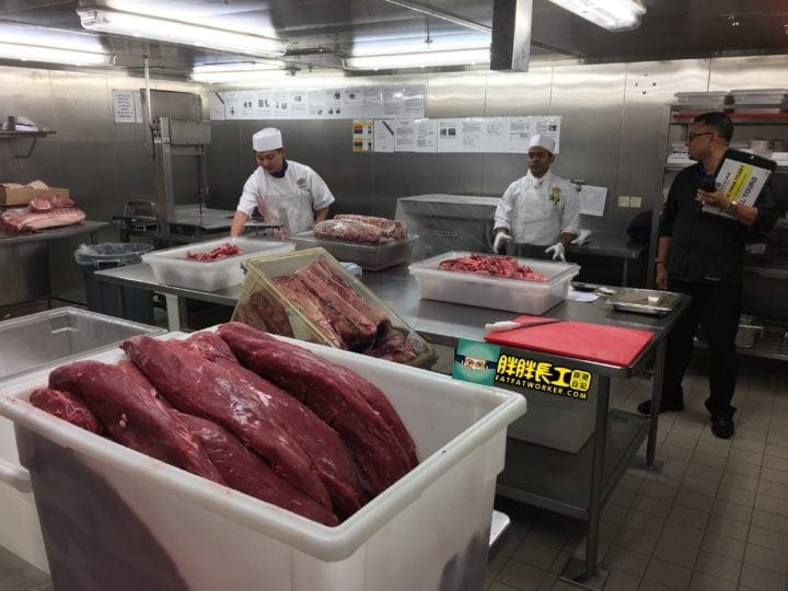 我在這邊停留了蠻長一段時間,不禁想到,郵輪上不同的工作人員,各自負責不同類型的工作。廚師在廚房裡面炒菜,可能還有一些些樂趣可言,至於這三個處理肉品的廚師,每天面對的永遠是一箱箱不會跟你講話的肉,一周可能OK、一個月可能OK,但如果長時間下來,這些廚師的生活不就是很無趣嗎?我沒有問他們的真實感受,但是想想,如果真的是這樣子的工作其實還蠻累人的啊。