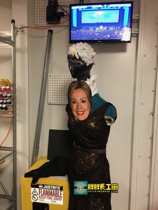 在更衣室的小角落裡,突然看到了希拉蕊的面具,這一年剛好是美國總統大選,我不禁好奇的問舞台總監:因為是支持希拉蕊反對川普嗎?全場大笑 (全場只有我是東方人,其他的團員全部都是西方人)舞台總監笑得樂不可支,回答「who knows」留下一個開放式的答案?