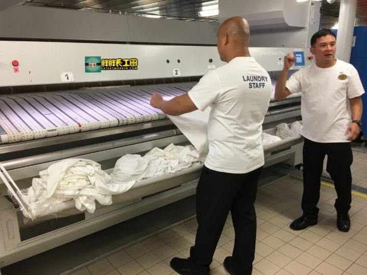 接下來是佔地多達2層樓的洗衣間,不,應該說是洗衣工廠。船上的乘客有3500多位,所以乘客的床單、被單、浴巾、毛巾、游泳池邊的海灘巾,還有上千個工作人員的制服等等,不論是燙衣服、燙褲子、甚至折毛巾,都是送到這裡一起處理。