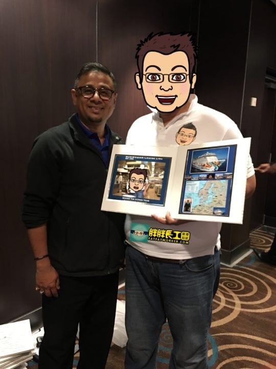 兩個小時的導覽一晃眼就結束了,隨團領隊又帶我們回到原來集合的地方,本以為到這就要解散了,但那個領隊很神秘而且微笑的跟我們講說「等一下!等一下!還有一個東西還沒給你們。」你猜得到那是什麼嗎?竟然是剛剛在廚房裡,工作人員特地幫我們拍的照片。這張難得的遊覽照,被放進精裝版的相本裡,旁邊還附上這一艘郵輪的全景照!我大吃一驚,都快感動地哭了。因為郵輪上專業攝影師拍的照片,都非常、非常、非常的貴,單買一張照片大概是 30美元。這價錢真的沒有誇張,就是這麼貴。除非買了很多、很多張,才會有較便宜的價錢;但就算再怎麼便宜,單價少說都還是在 20美元/張以上。NCL導覽行程之後,居然免費送大家一人一張,噢!不對!應該講的是一人一本,這個紀念品實在太讓人感動了!