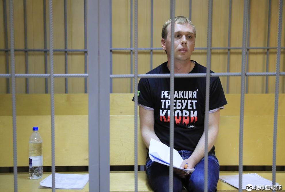 俄國知名調查記者戈盧諾夫於上周四遭警方以製毒與販毒等罪名拘捕,引發俄國媒體界一片譁然,紛紛聲援該記者、指稱該記者受到陷害。圖為在法院被告拘留室中的戈盧諾夫。