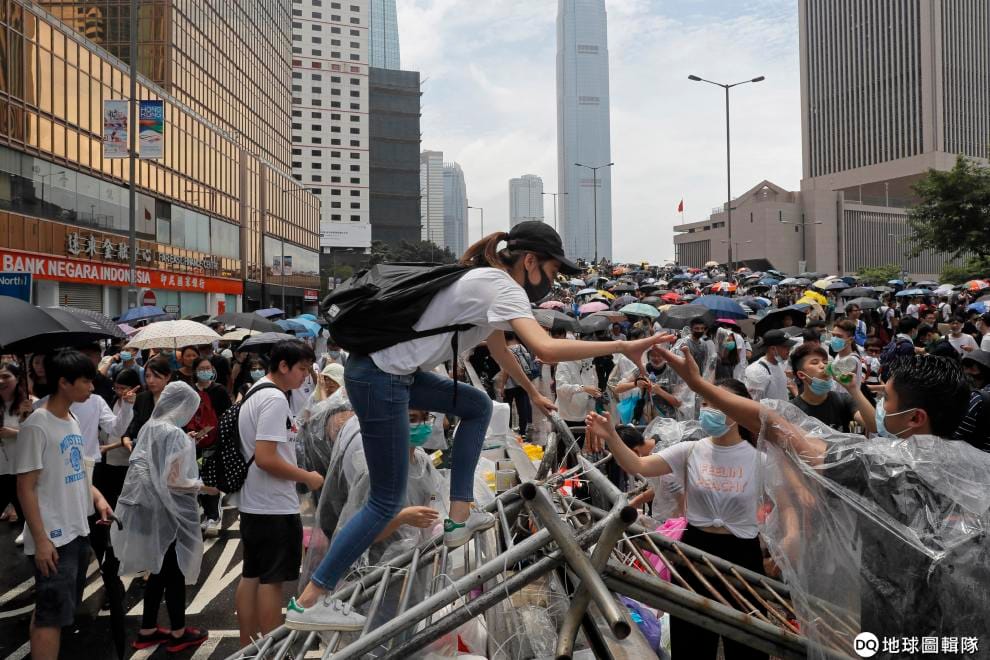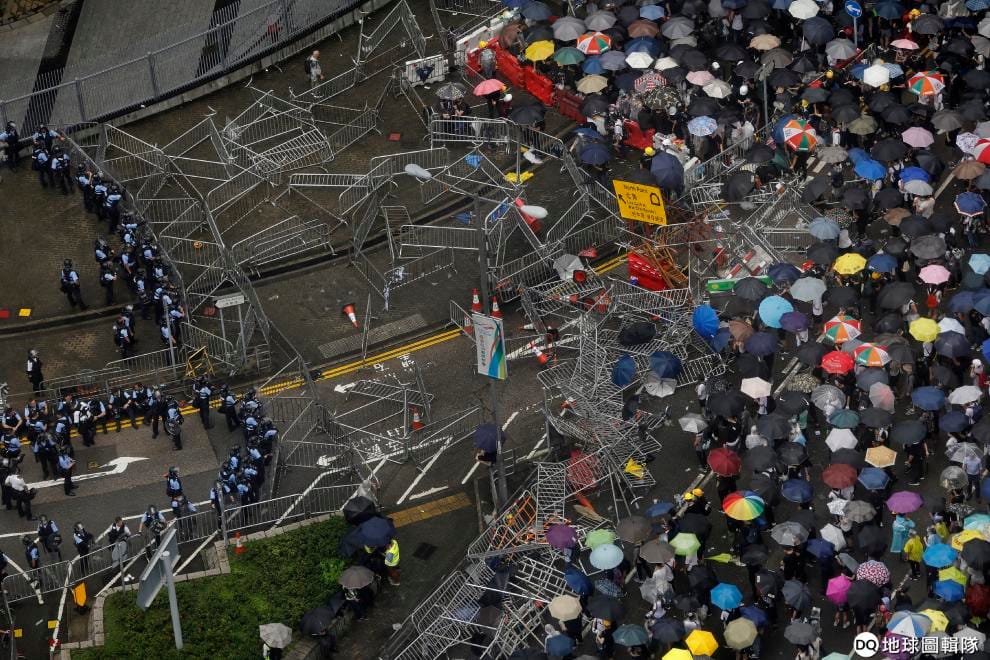 美聯社 / 達志影像現場開始有人設立物資站或是主動購買水、雨傘、雨衣並送到示威現場。有些人則把人行道上的地磚挖起來充當磚牆。