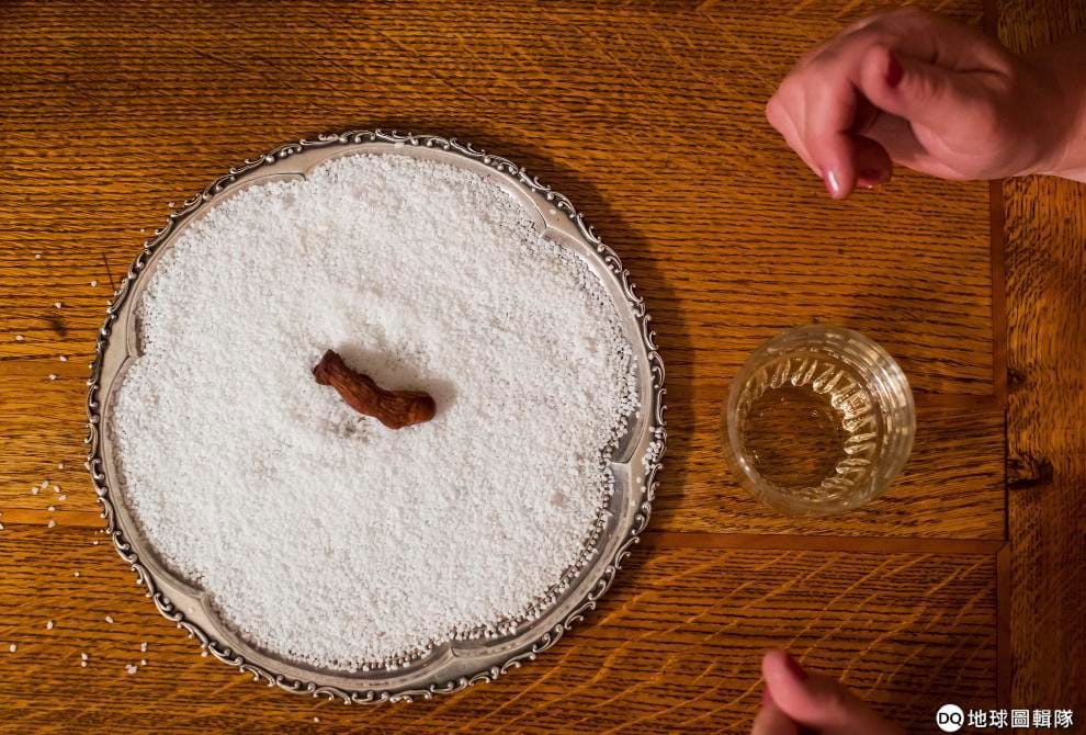 作為調酒材料的腳趾會被放在岩鹽中保存,需要時才拿出來使用。