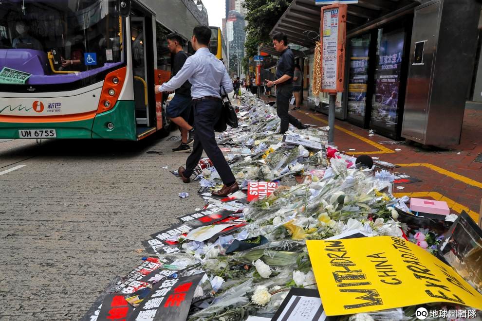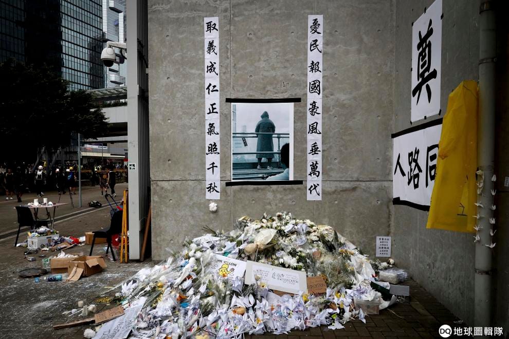 在反送中示威者於 15號墜樓身亡的事故地點,人們紛紛擺放了白花悼念他的離世。