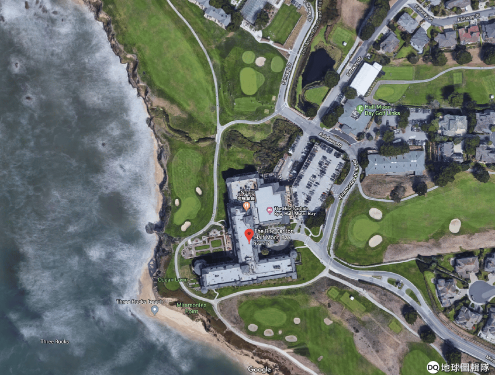 圖中紅色標記處,即為臨海的半月灣麗思卡爾頓酒店。