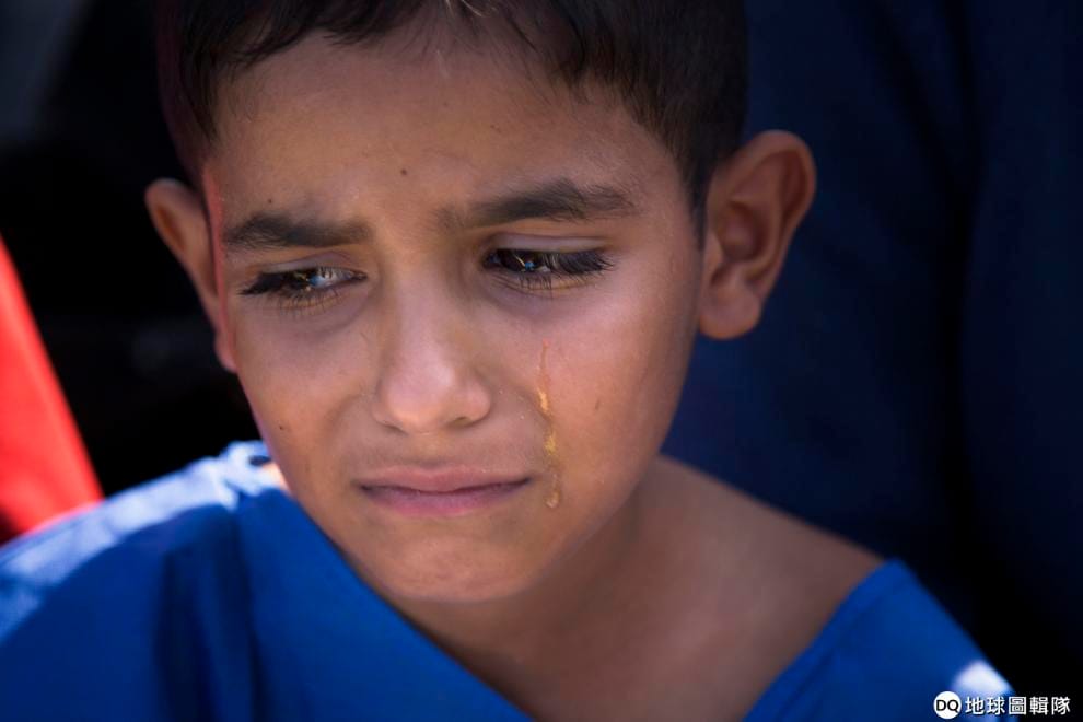 美聯社 / 達志影像乘坐同一艘船的一名敘利亞七歲男孩在被救起後,裹著毛巾落下眼淚。