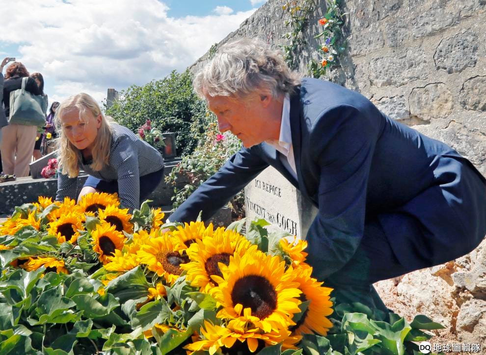 2015年,來自梵谷家族的成員到梵谷長眠的奧維小鎮墓園掃墓,可以看到梵谷的墓前擺放著盛開的太陽花。