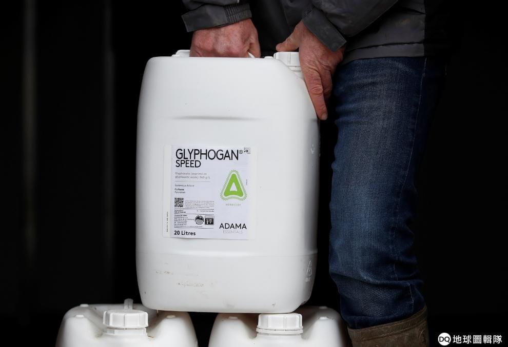 2017年,一名法國農人提著用嘉磷塞為基底的農藥接受媒體的訪問。嘉磷塞對農民來說好用又便宜,目前仍很難找到替代品,在政府準備禁用下加深了當局和農民之間的衝突。