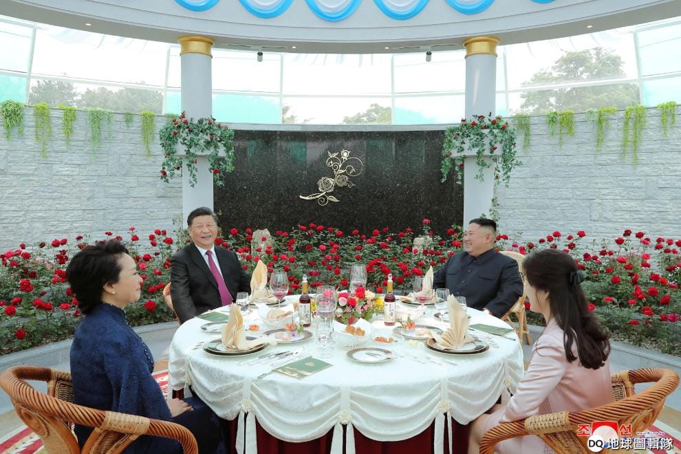 在習近平出訪北韓的午宴上,金正恩夫婦和習近平夫婦在眾人的關注下用餐。