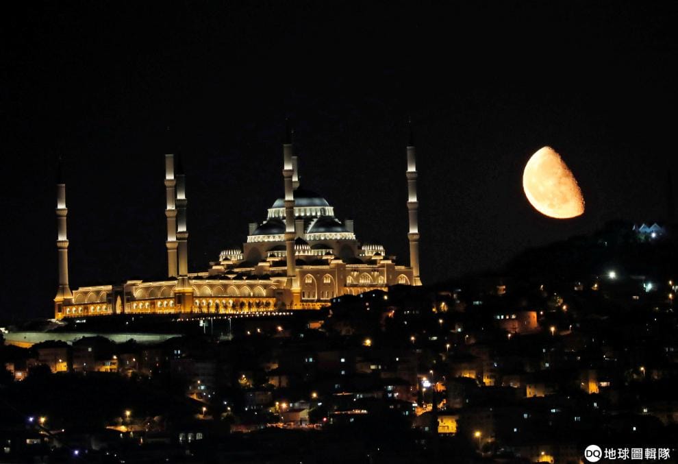 在伊斯坦堡,一輪明月高掛空中,與一旁的強穆勒佳清真寺(Camlica Mosque)相互輝映。