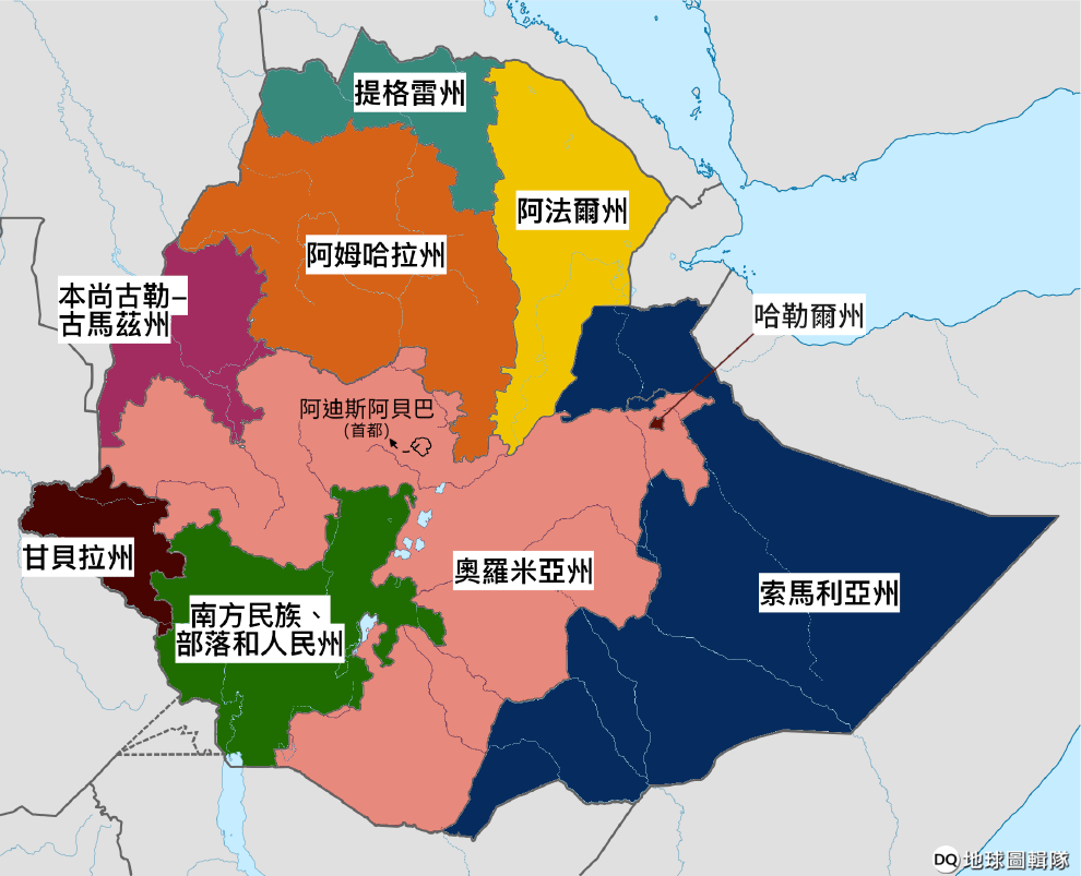 圖為衣索比亞各州分布,以及首都位置。衣索比亞是以國內的族群分布來劃分各州疆界。其中奧羅米亞州的奧羅莫族為衣索比亞人數最多的民族。阿姆哈拉州的阿姆哈拉族則為第二大民族。