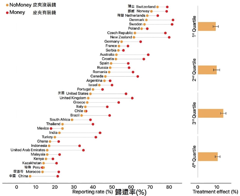 從這一張圖表中可以看到,各國民眾對有/沒裝錢皮夾的歸還率,而這和一國的收入水平有相關。