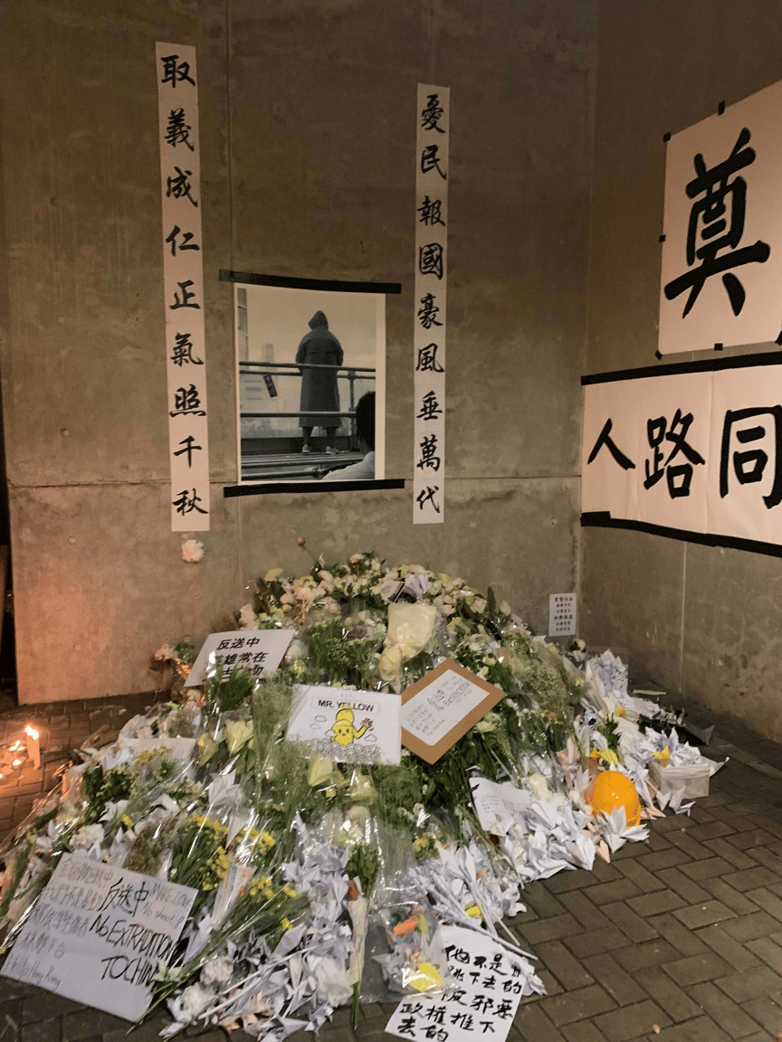 本月 17號在香港,一名示威者穿著黃色雨衣站在街頭向 15號身穿雨衣、在太古廣場墜樓身亡的男子致意。