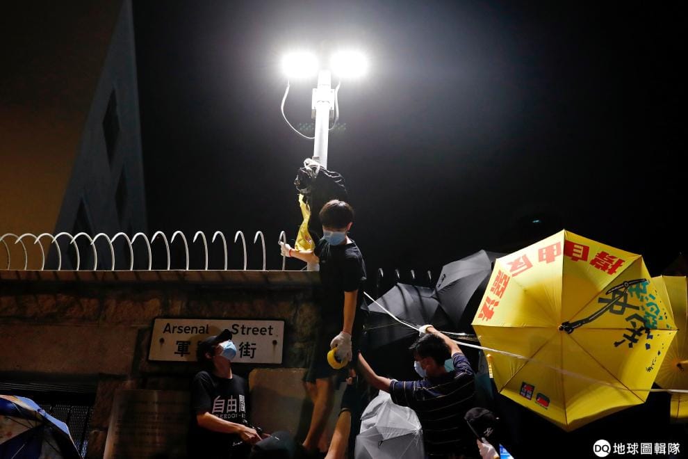 本月 21號,示威者包圍了香港警察總部抗議。現場則有人高舉著象徵被染血的紫荊花旗。