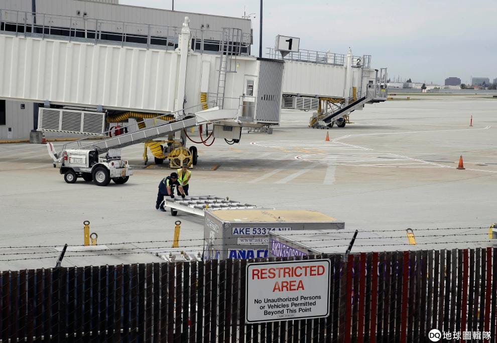 隔著圍籬,工作人員正在機場裡忙碌著。偷渡者通常是設法攀過圍籬並躲在起落架之間。