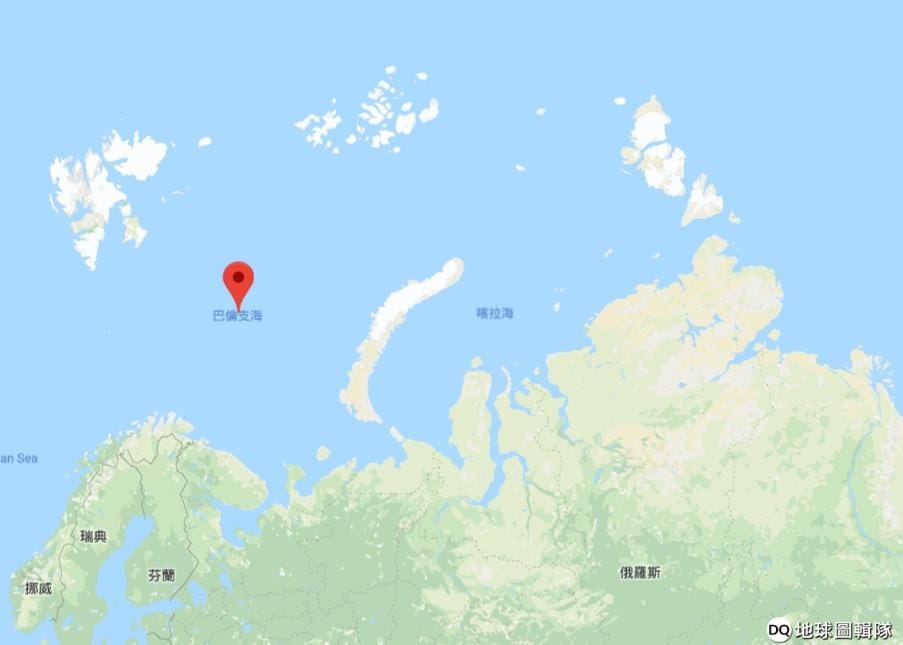 圖為巴倫支海域和俄國的相對位置,巴倫支海位於俄國北方,是北冰洋的陸緣海之一。