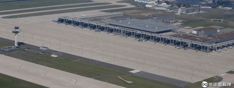 圖為 2013年,柏林布蘭登堡機場的主要航廈、停機坪和飛航管理塔台。