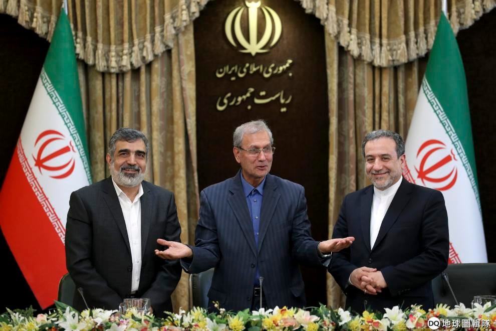 周日,伊朗召開記者會,大動作宣布將提煉濃度更高的濃縮鈾,打破 2015年伊朗核協議的限制。圖左到右分別是伊朗原子能組織發言人卡蒙凡迪、伊朗政府發言人拉比(Ali Rabiei)和伊朗副外交部長阿拉基奇。