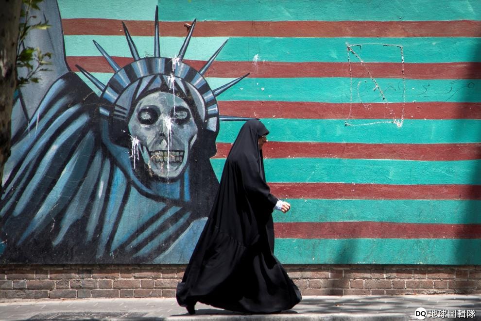 在原美國駐德黑蘭大使館前,可以看到伊朗民眾把紐約自由女神像畫成骷髏的壁畫。