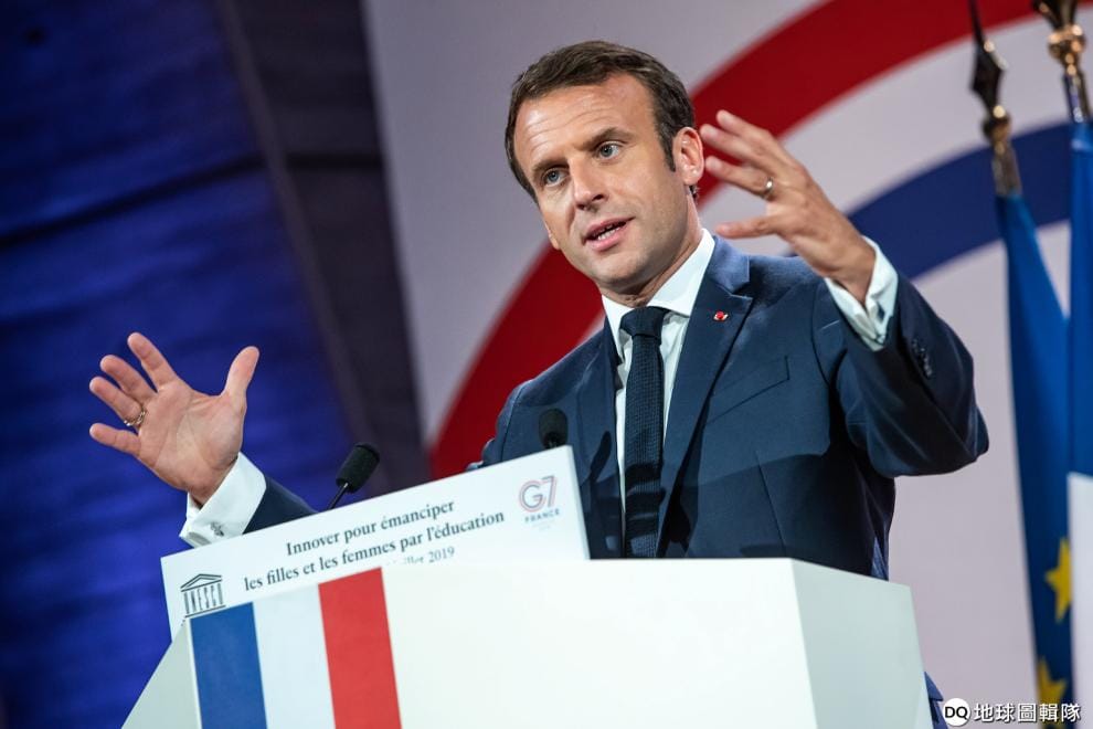 周六,法國總統馬克宏搶先一步致電伊朗總統魯哈尼,希望可以再好好協商。圖為周五(5)時,馬克宏於教育與發展G7部長高峰會上演說。
