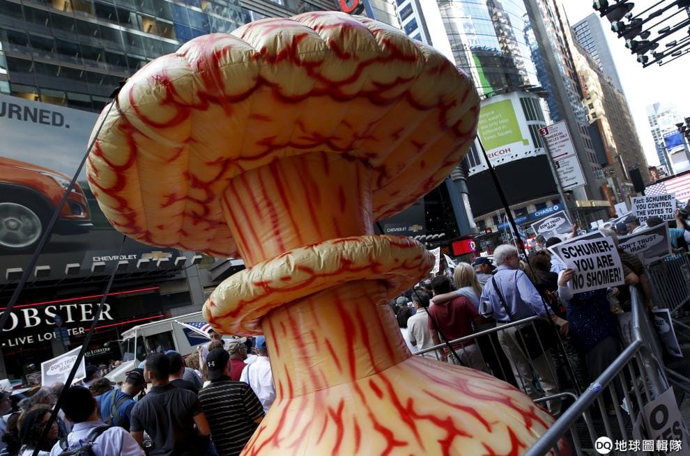 2015年7月22日,美國紐約時代廣場出現了象徵原子彈爆炸的充氣蕈狀雲。當時,不少民眾集結在當地抗議美國簽署伊朗核協議。