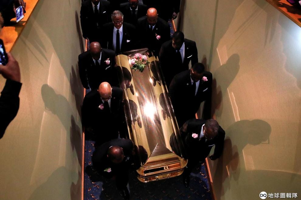 圖為裝著美國靈魂歌后艾瑞莎弗蘭克林遺體的「普羅米修斯」棺材,這口14K金的鍍金棺材要價上百萬元台幣。