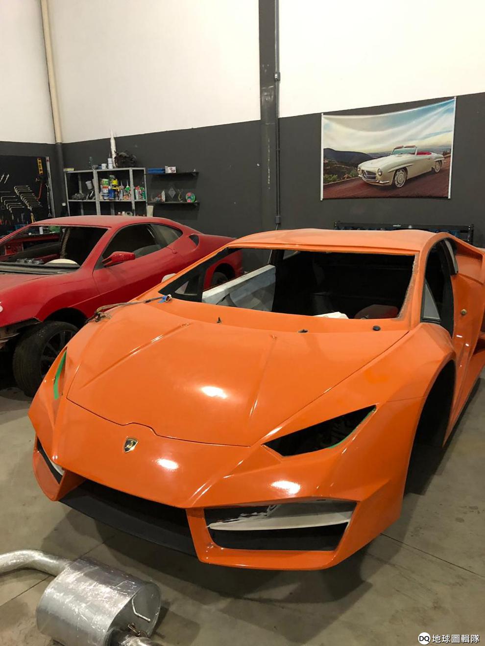 仔細看一下圖中這台尚未完成的橘色汽車,會發現它和藍寶堅尼的設計十分類似。