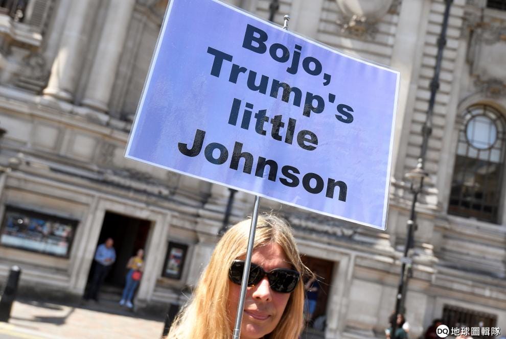 在倫敦街頭,一名反對強生的民眾手舉寫著「波強(Boris Johnson,取其首字Bojo),川普的小強生」字樣的海報嘲諷他。