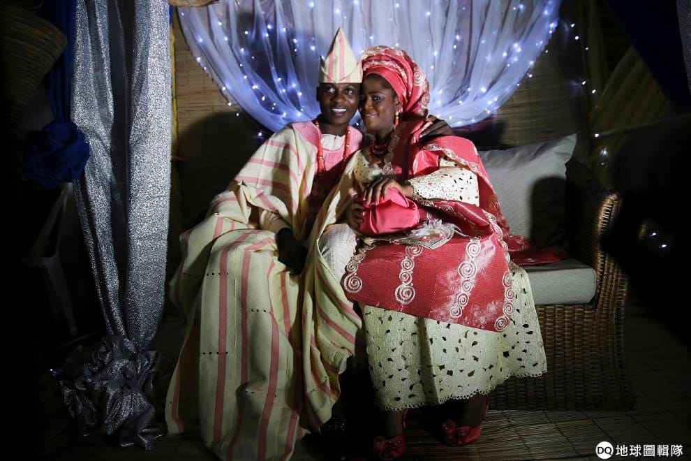 2014年,一對奈及利亞新婚夫妻在傳統婚禮上開心拍照。