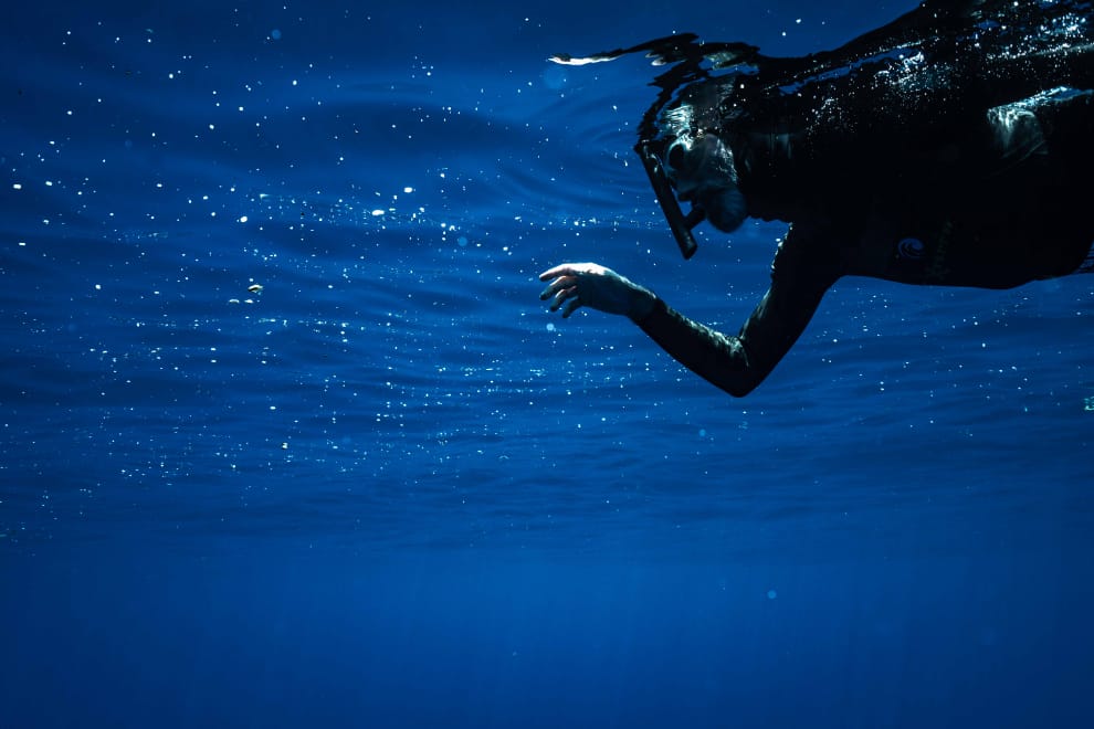 研究報告顯示,海水中充滿著肉眼難以見到的塑膠微粒、超細合成纖維,這些物質容易隨著飲食、呼吸,重新回到我們的體內。圖為 7月27日,勒孔特游過一整片他稱作「水下塑膠微粒霧霾」的區域。