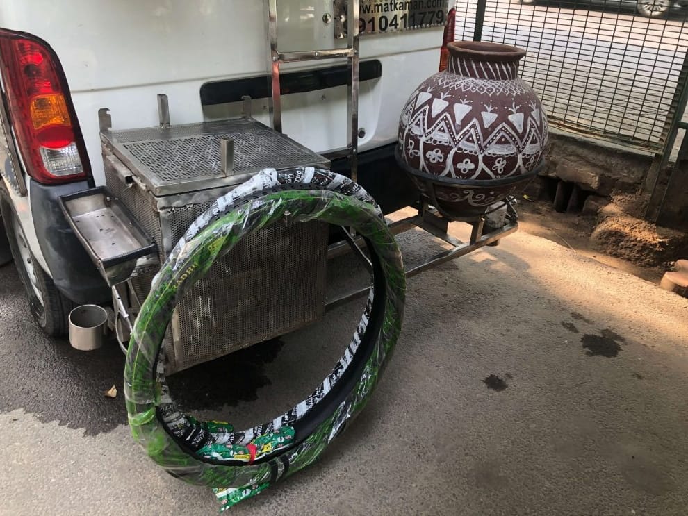 領著我到煎台後方的白色箱型車,我原本以為那只是放置煎台工具所用,沒想到車子上頭居然有無數個計壓器,「你看,這個是氮氣,然後下面這是一個水箱。」納塔拉詹像是在炫寶似地,指著煎台斜前方的馬路人行道:「看到了嗎?那裡是不是有一排陶甕?我在新德里設了超過一百個這樣的供水處,旁邊還有兩個給腳踏車輪胎灌氣的設備。」這些就已經足夠讓我瞠目結舌了,沒想到納塔拉詹又拉著我到廂型車的後面,上頭掛滿了各色書包,底下還有幾個新的腳踏車車輪,「這些東西都比外面的市價便宜一半以上!我不是 NGO,這全都是我自己做的。」