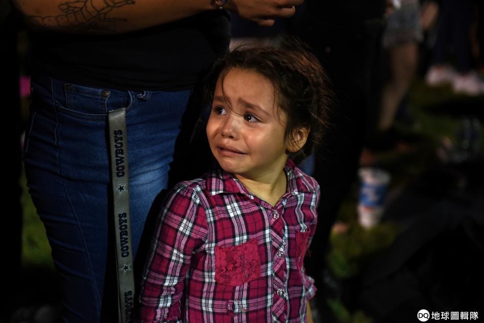 在德州沃爾瑪超市槍案發生後,民眾在守夜活動上哀悼受害者。其中,一名小女孩流下淚水。