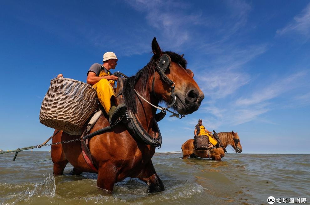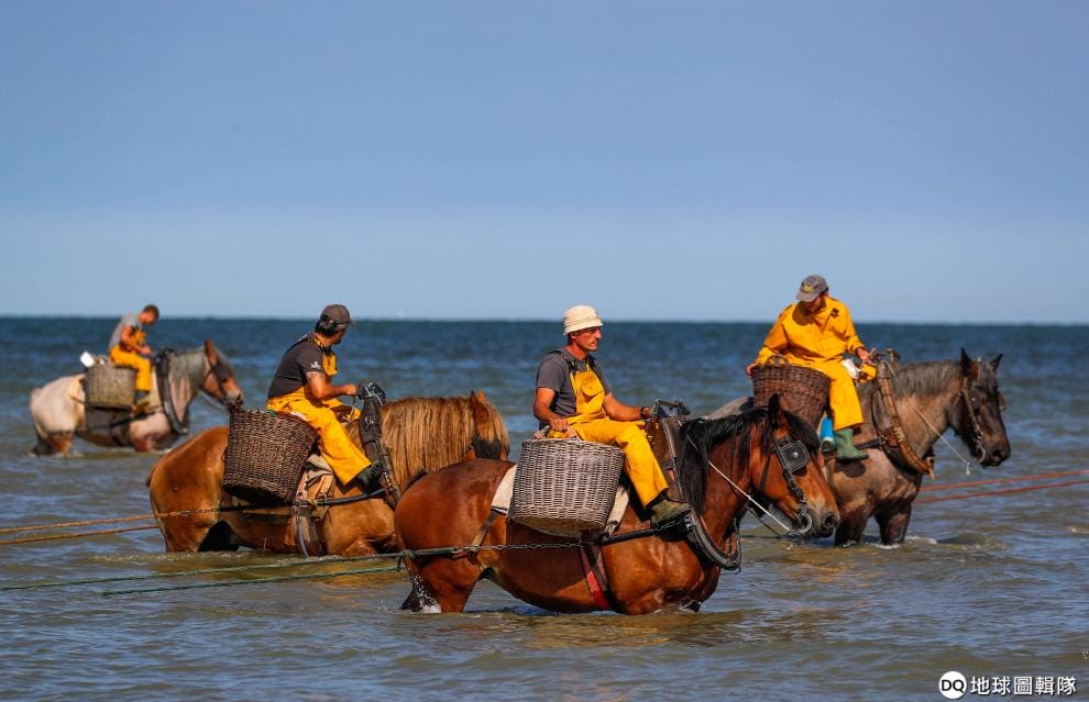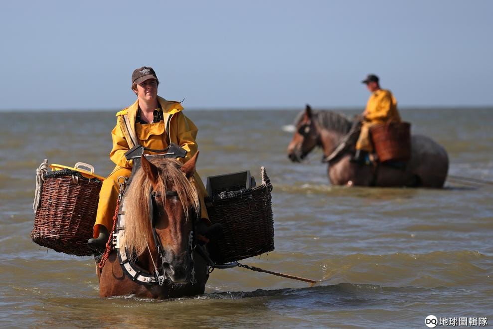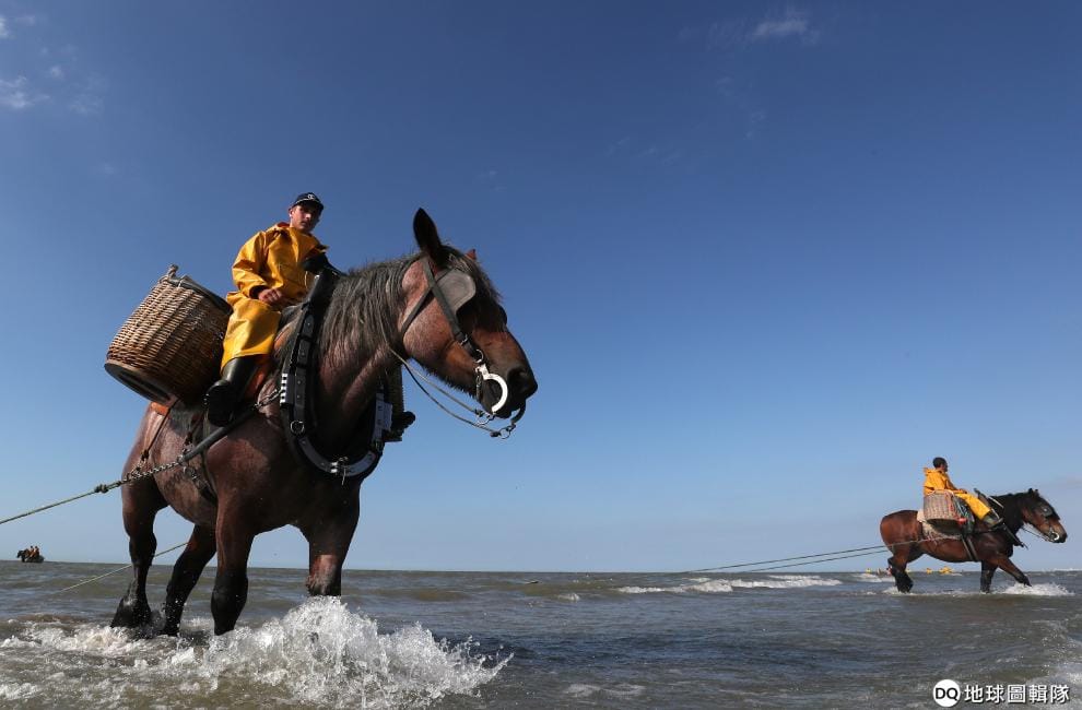 在比利時西南海岸的漁村裡,15名漁民使用騎馬捕蝦的古老傳統技術捕蝦。