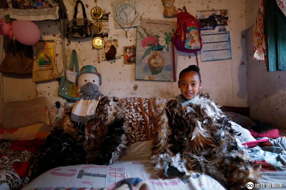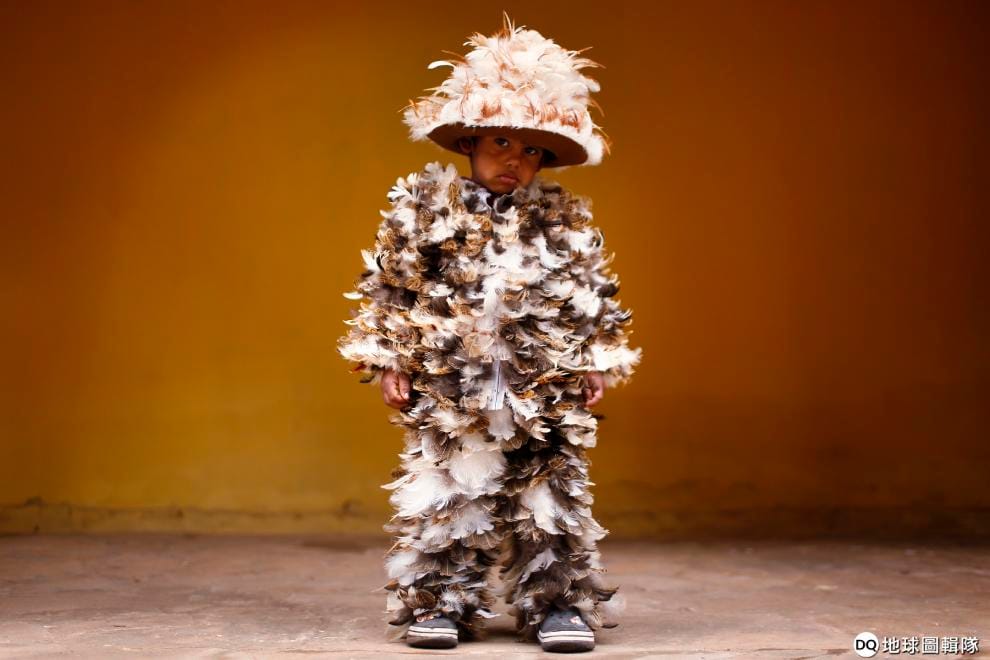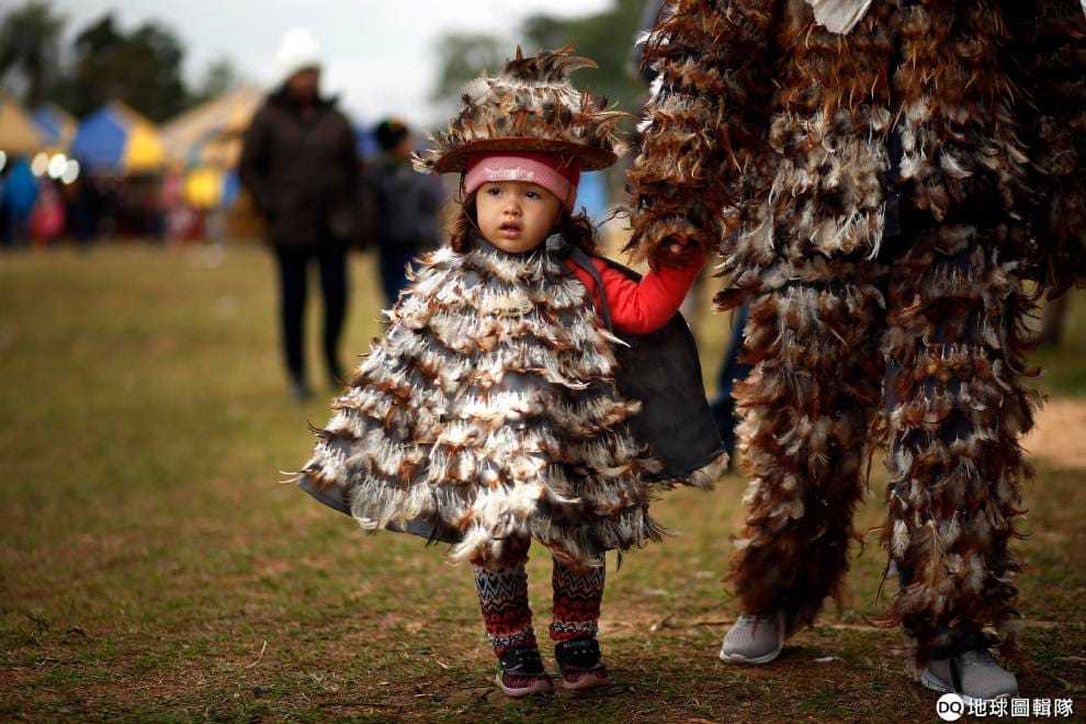 美聯社 / 達志影像今年 4歲還懵懵懂懂的耶格洛斯(Josia Sebastian Yegros)穿著全套羽毛裝,在鏡頭前留影。
