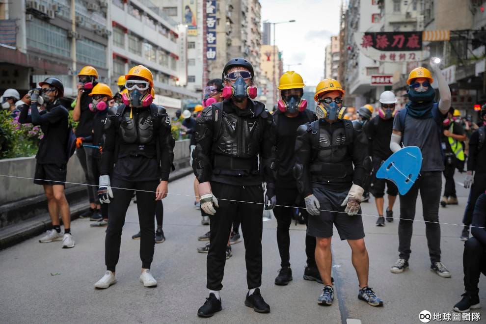 8月11日,全副武裝的示威民眾在街頭表達訴求,並且隨時注意香港警察的動向。