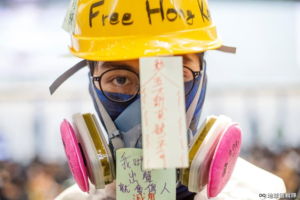 8月9日,一名在香港國際機場參與反政府示威活動的男子看向鏡頭,他戴著的黃色頭盔和防毒面具正是這幾周以來,示威民眾的標準配備。