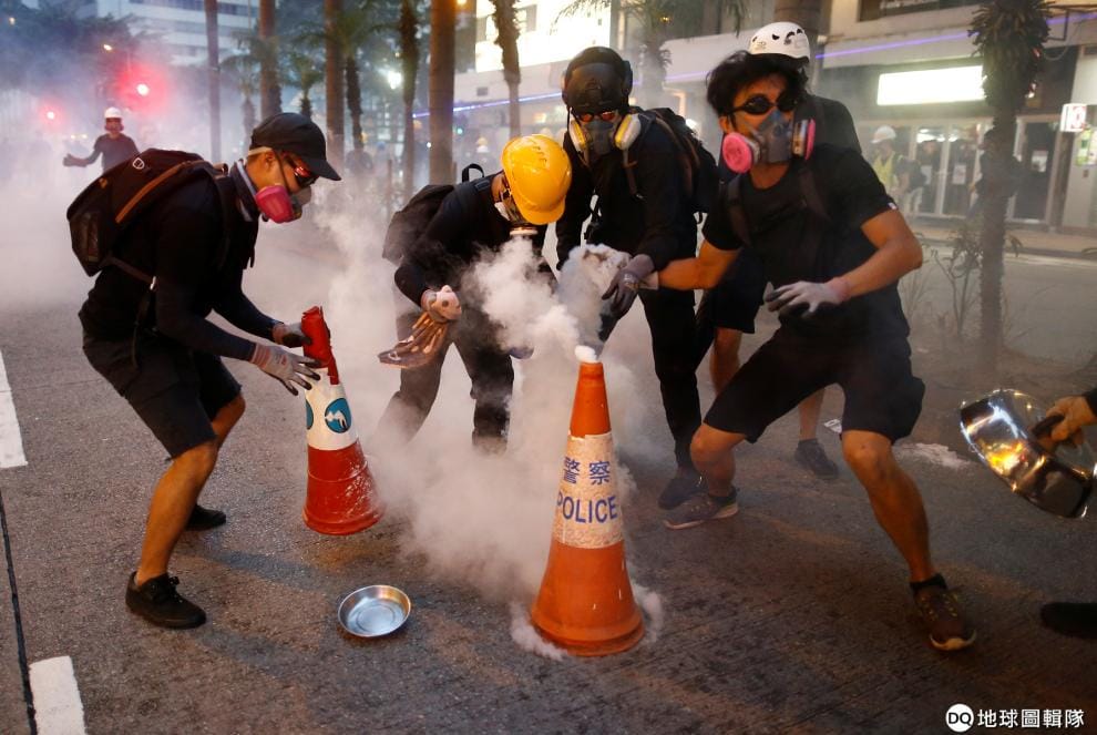8月11日,在香港灣仔區,面對警察射過來的催淚瓦斯,示威民眾紛紛想辦法降低傷害。