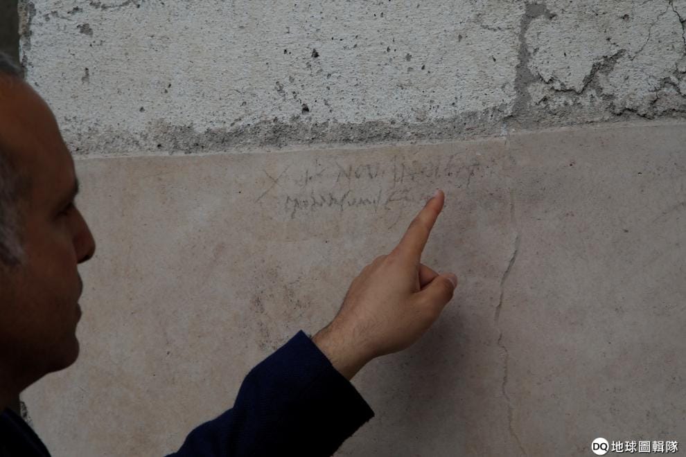 一名考古學家讀著龐貝古城遺址牆上的銘文,藉此推測維蘇威火山其實不是在西元 79年的八月爆發,而是在十月爆發。