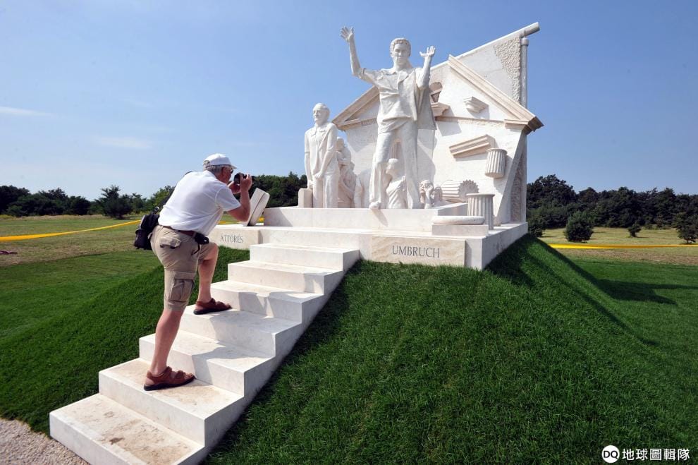 在索普隆科西達小鎮的「泛歐野餐」紀念公園內,一名男子拿著相機拍下匈牙利雕刻家梅洛可(Miklos Melocco)的作品《突破》。