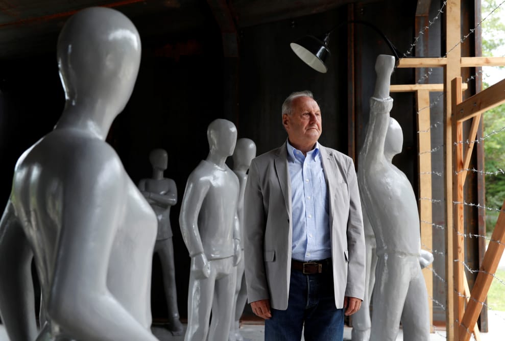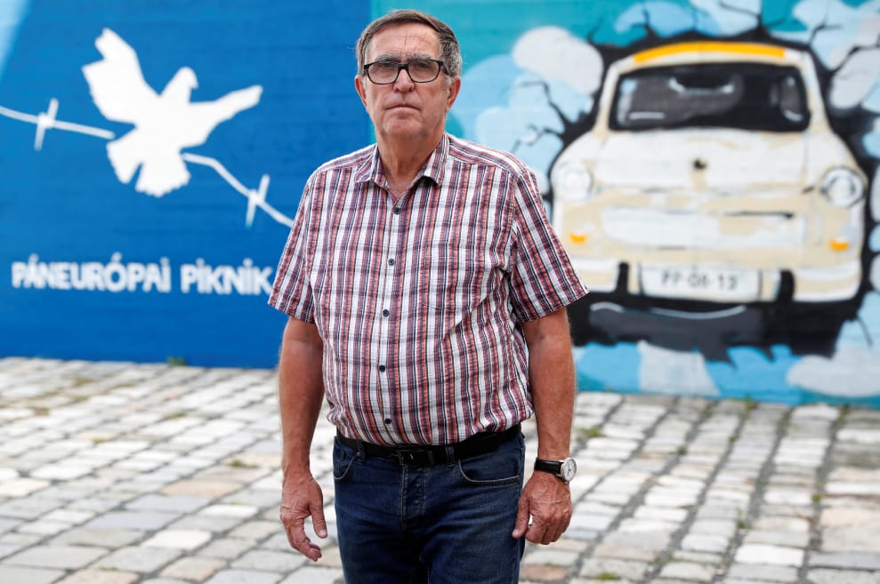 圖為當時負責規劃「泛歐野餐」的馬加斯,他在匈牙利索普隆科西達小鎮的「泛歐野餐」紀念牆前方留影。
