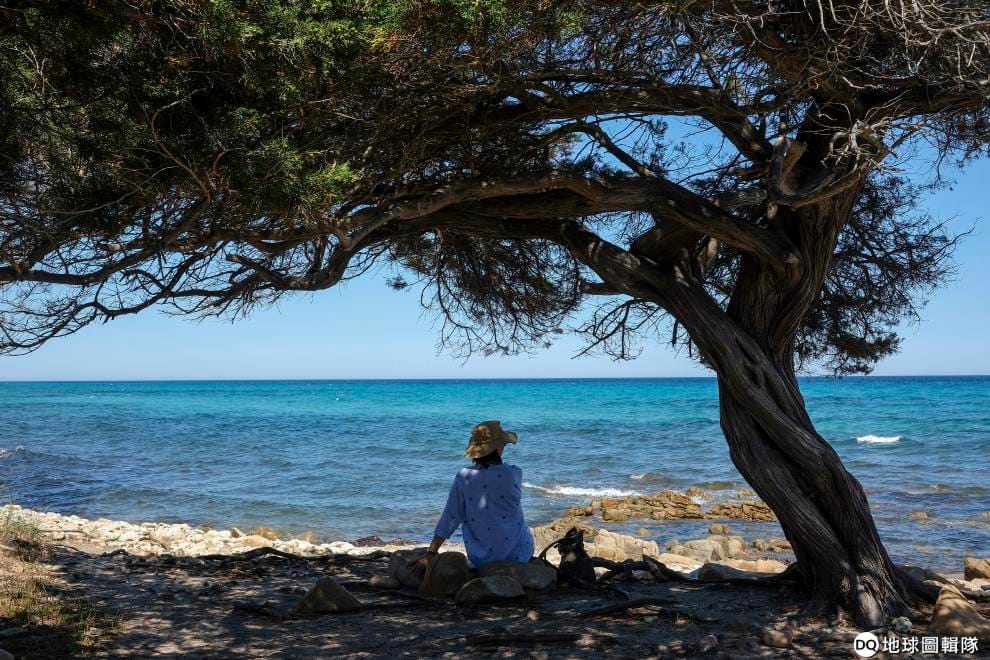 薩丁尼亞島的海邊,一名遊客坐在樹下乘涼看海。