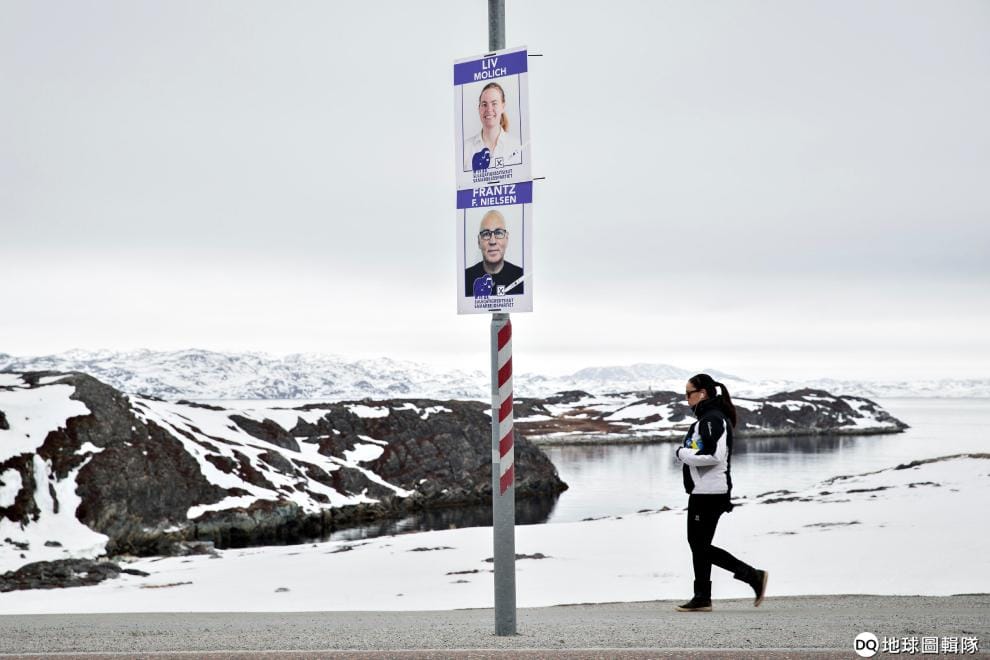 2018年4月,一名格陵蘭人走過議會成員的競選看板。