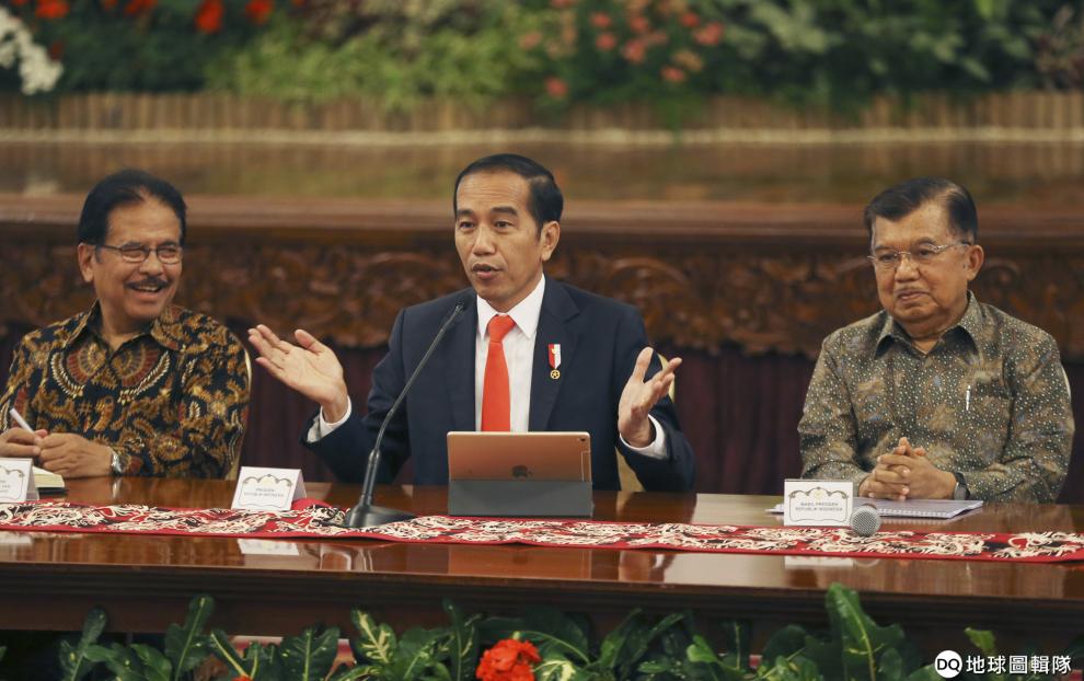 周一,印尼總統佐科威(中)在副總統卡拉(Jusuf Kalla,右)和農業與土地規劃部長達里耶(Sofyan Djalil,左)的陪同下,宣布印尼準備將首都遷往東加里曼丹省。