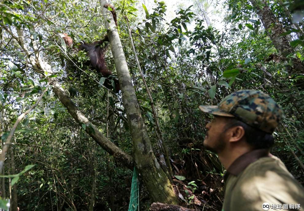 在加里曼丹島上的雨林,保育人員看著掛在樹上的紅毛猩猩。