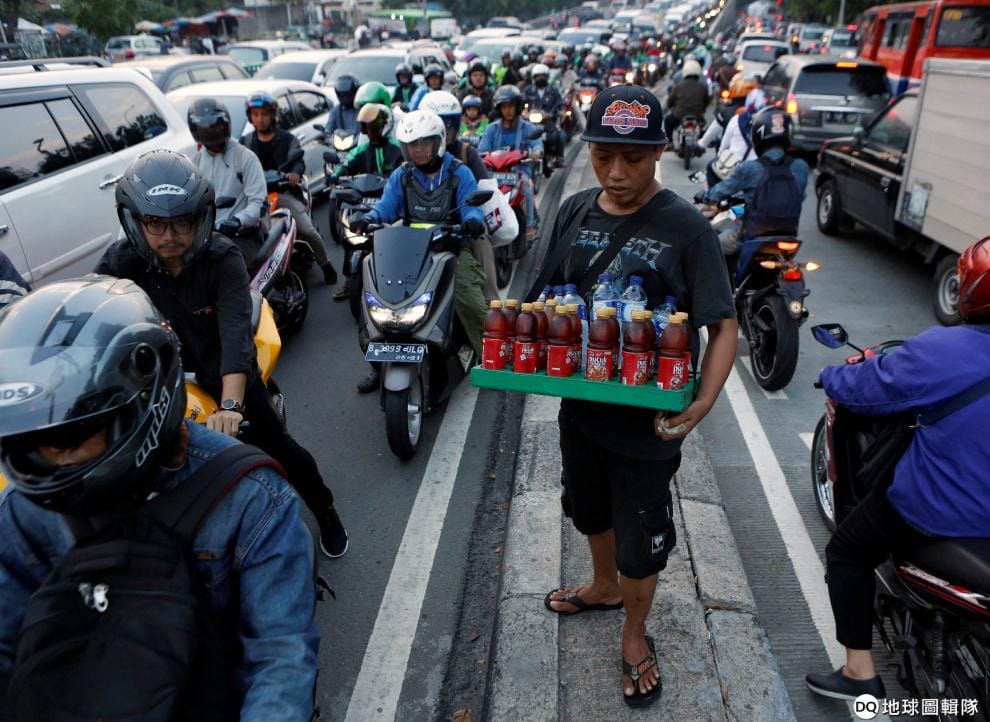 對住在雅加達的民眾來說,上下班被塞在車陣中是家常便飯,街頭小販也抓準商機賣飲料給民眾解渴。