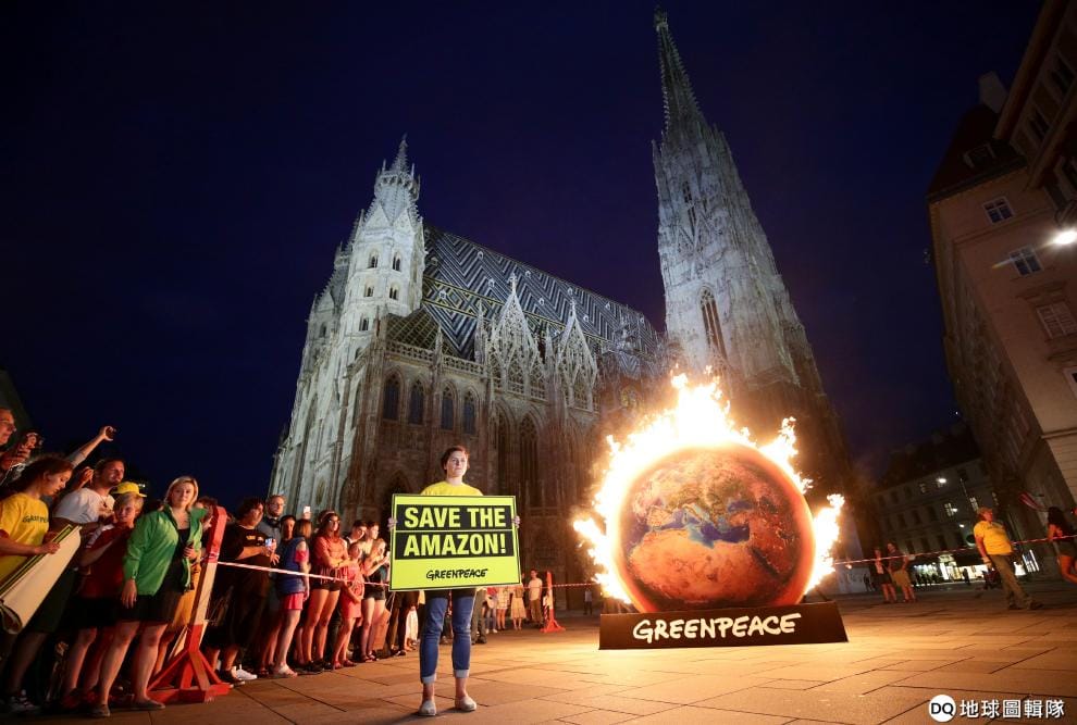 在維也納的聖史蒂芬大教堂(St. Stephen's Cathedral),綠色和平(Greenpeace)組織的成員舉著寫有「拯救亞馬遜」字樣的牌子,站在一顆熊熊燃燒的地球旁,抗議巴西亞馬遜雨林濫墾濫伐的情況太猖獗。
