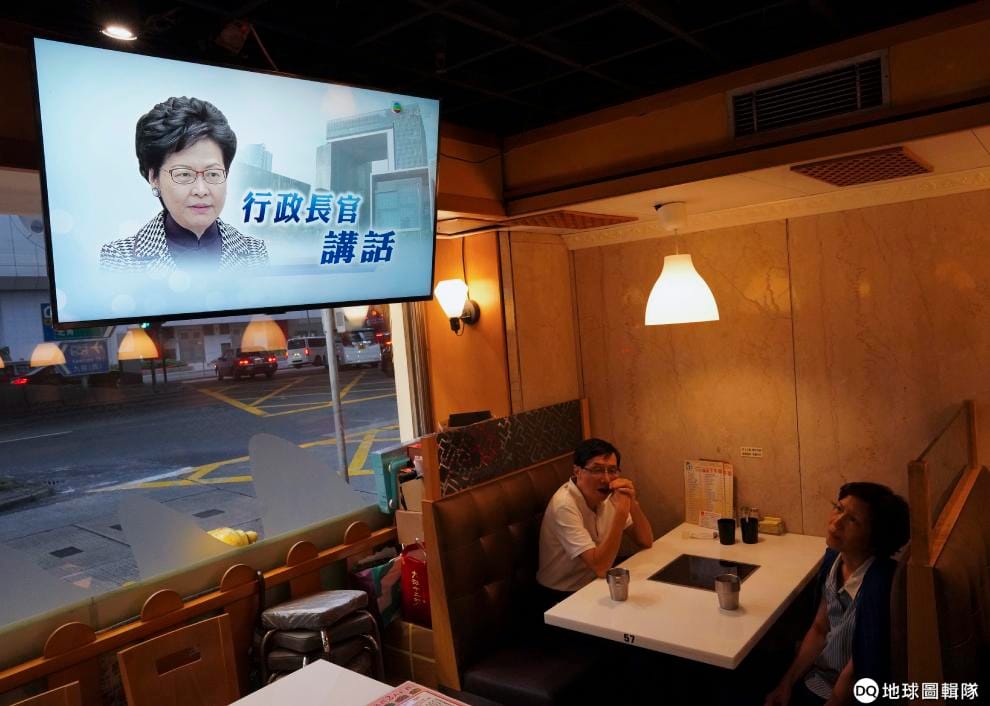 4號下午,香港的一間餐廳正在播放香港特首林鄭月娥的演說。