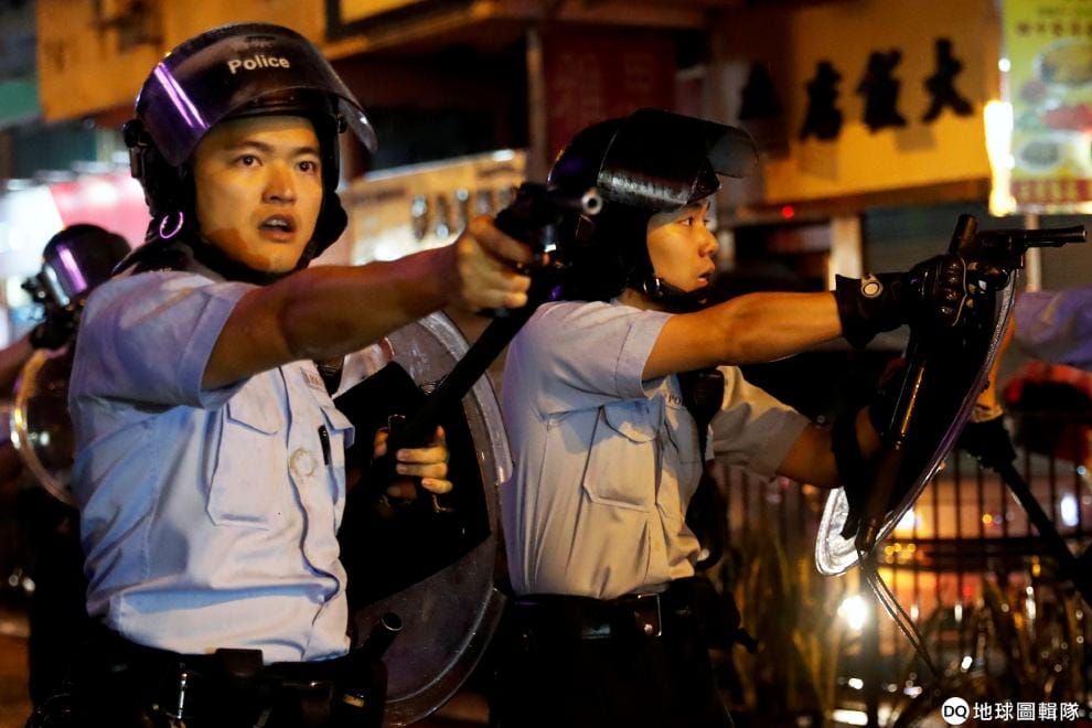 2019年8月25日,在香港新界西南荃灣區,港警拔槍瞄準示威民眾。