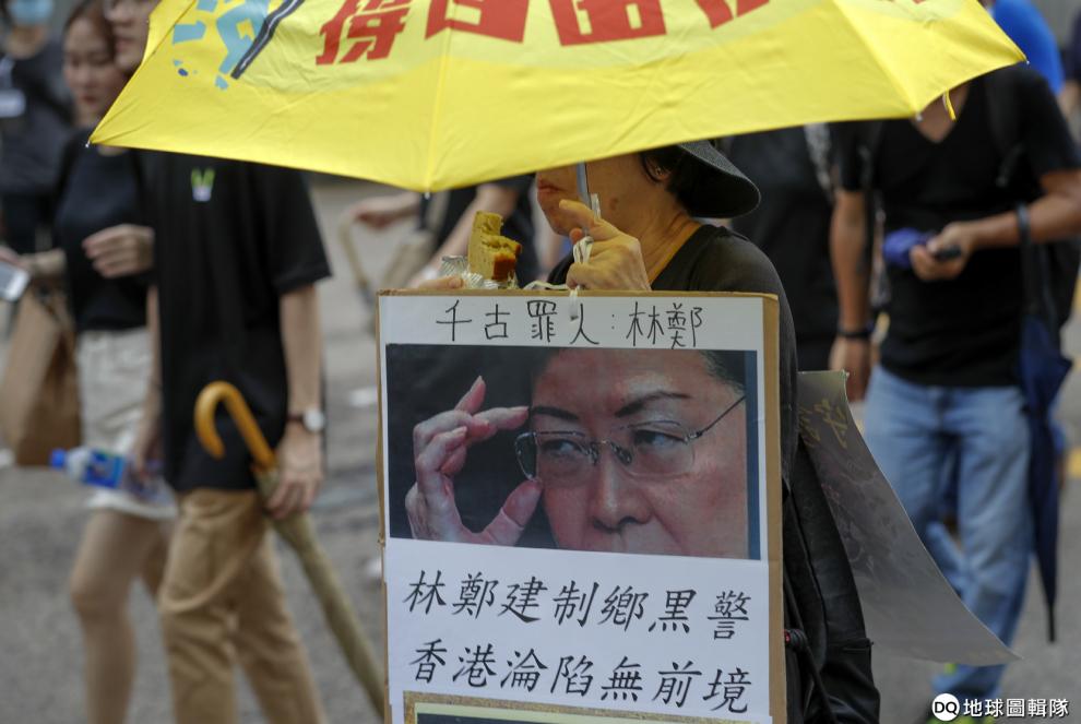 在示威活動中,一名民眾帶著寫有「千古罪人:林鄭」的牌子出現,和其他民眾一起從反送中到爭民主。